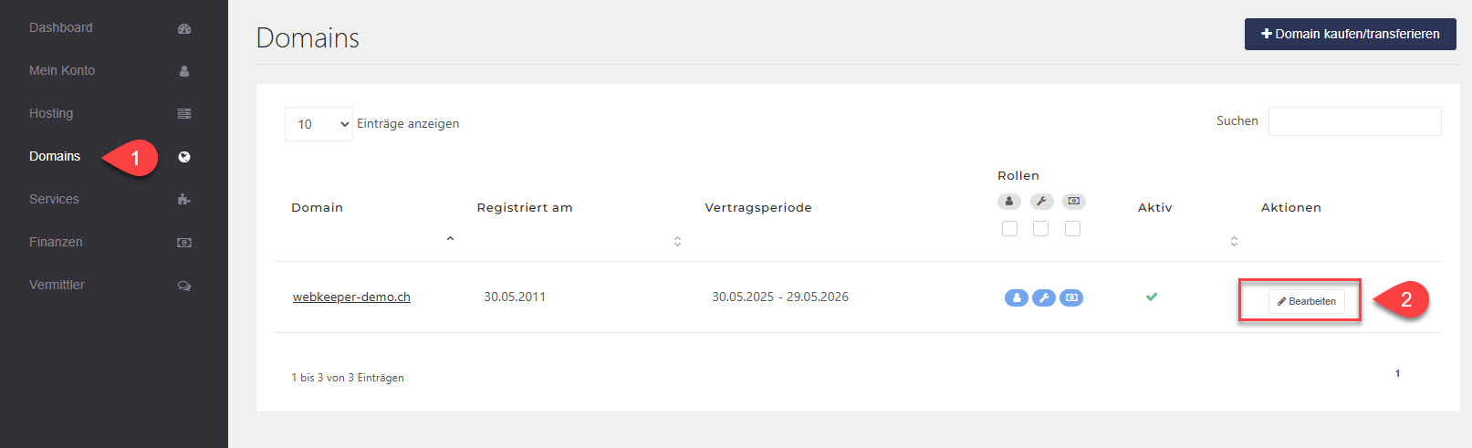 Gehen Sie dann links im Menü auf "Domains" und klicken Sie bei der Domain, bei der Sie die Kontaktdaten ändern möchten, die Schaltfläche "Bearbeiten" an. Alternativ können Sie auch direkt auf den Domainnamen klicken.