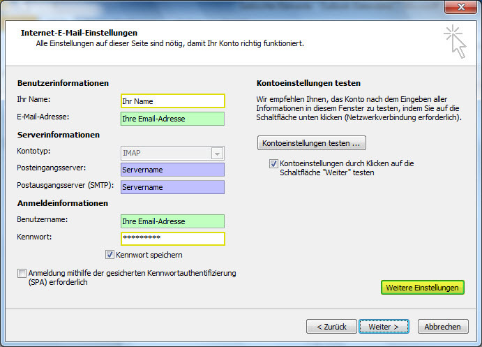 7. Überprüfen Sie Ihre Kontoeinstellungen indem Sie auf "Kontoeinstellungen testen..." klicken.