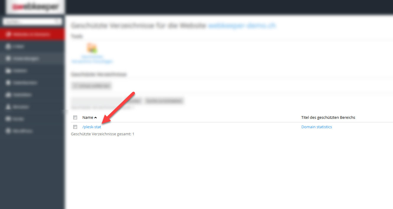 Klicken Sie nun auf den geschützten Ordner, im Fall der Statistiken lautet dieser "/plesk-stat"